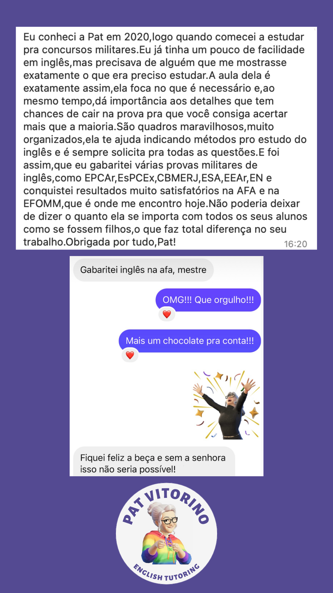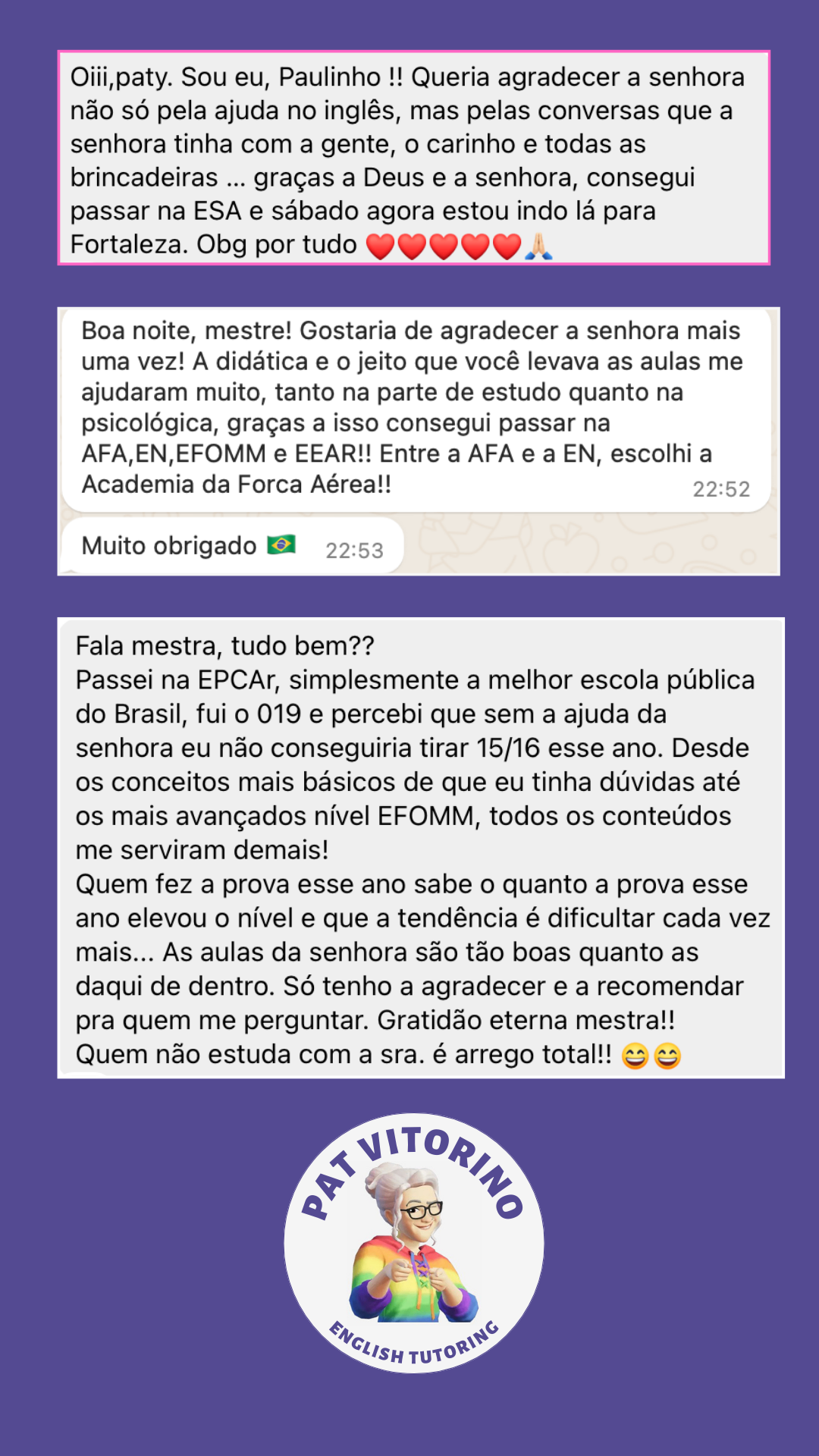 No curso PAT VITORINO English Tutoring, você vai encontrar a abordagem específica para o seu concurso militar, aquela mesma que você esteve procurando esse tempo todo.